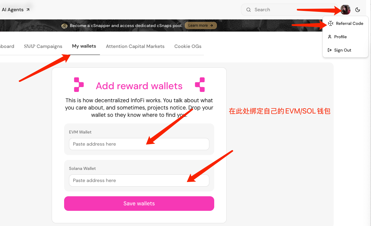 访问https://www.cookie.fun/uqIbHjTu,连接X账号(Twitter)和EVM钱包(如MetaMask)。